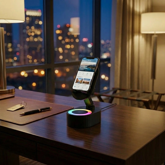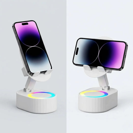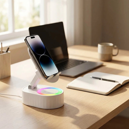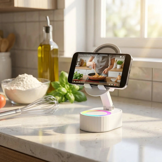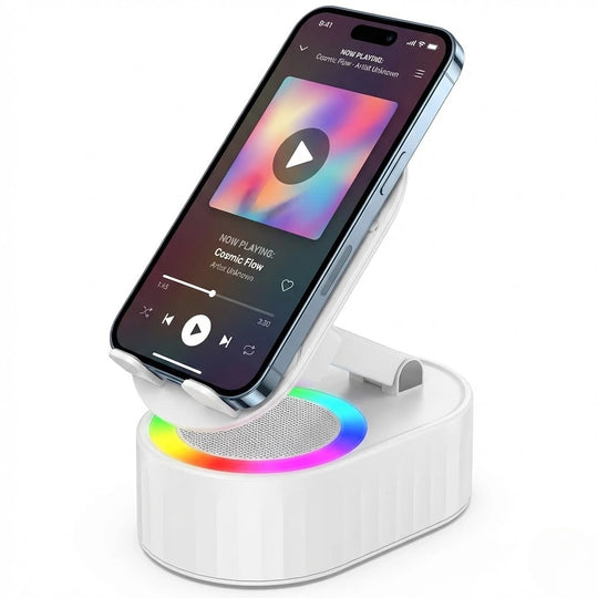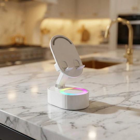 Upgrade your daily routine with a 4-in-1 hub that plays your music the second you set your phone down—no Bluetooth pairing required. Whether you're following a recipe or joining a video call, this adjustable stand keeps your screen at the perfect angle while setting the vibe with built-in ambient lighting.